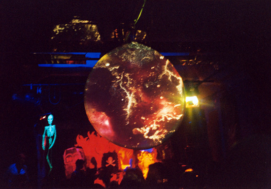 Het ronde doek dateert uit 2000. In het begin gebruikte we het om er een aantal behoorlijk psychedlische dia's op te projecteren. Door van twee kanten tegelijkertijd te projecteren, lijkt er een 3-dimensionale diepte in het beeld te ontstaan. Later zijn we ook gebrukk gaan maken van video-animaties / videobeelden.